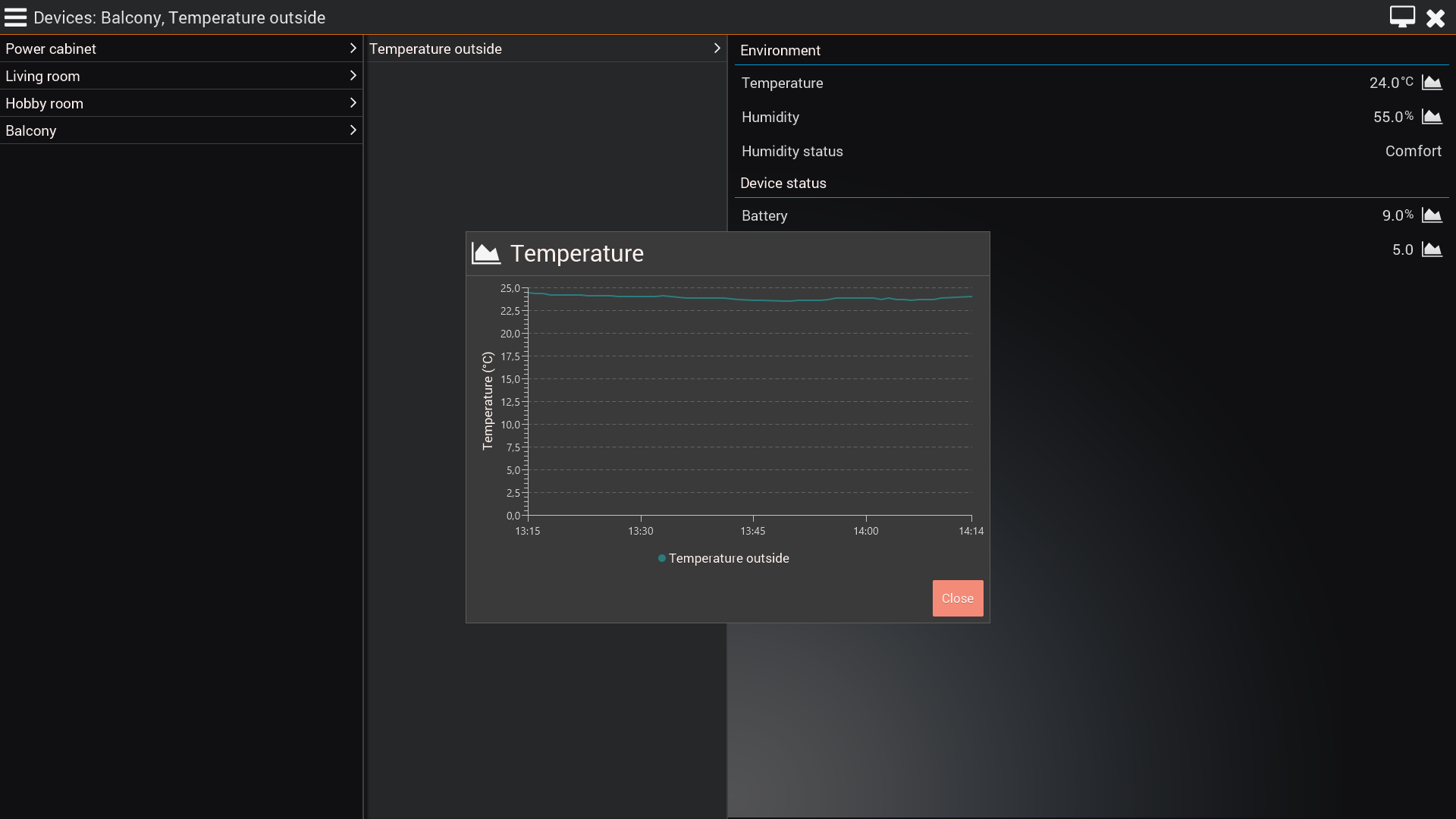 4.) Altered graph to hide battery level and instead show switch state of a device that influences the sensor. (A big ventilation in the same room)Best is maybe to try different Controller and see whats best to fit your needs.