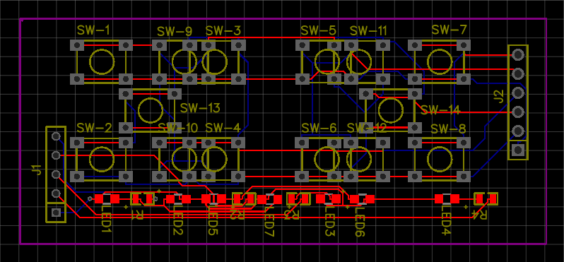 My plan for now is to use each row as an OFF and an ON button with a corresponding status LED, but the possibilities for this are much greater. This could be used as a controller for 8 individual scenes, bright/dim controls, or whatever you can think of. This could be used to talk directly to other nodes for lighting control or any number of things. You could build other switch boards for this that would maybe contain more switches (eliminating the LEDs of course), or any number of combinations of switches and sensors.