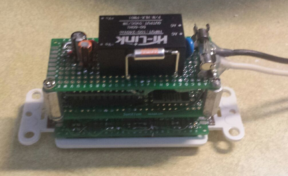 Very interesting designs @enterprised and @dbemowsk. I've also been working on my own version of decora switch and relay system. It's designed to use empty keystone switch plates with 1, 2, or 3 switches and uses keystone jack fillers as the switch covers so they look almost commercial. It's a 3 PCB system. The front PCB has the switches, LED's, reset button, CPU, and an RFM69 or NRF radio. The middle PCB has a MeanWell IRM-02 or HLK AC->DC converter (with fuse, thermal fuse, and varistor), a replaceable fused 10A AC relay with opto-coupler isolation, 5V and 3.3V rails and a 2 wire temperature probe to measure the temp of the PSU module. The back PCB is just a cover to insure no sharp solder points are in an electrical box. I decided that since this will be in my walls, I would only use name brand parts (from digikey and mouser) on the high voltage side which increases costs but should reduce the risk of fire (or at least make me feel better).