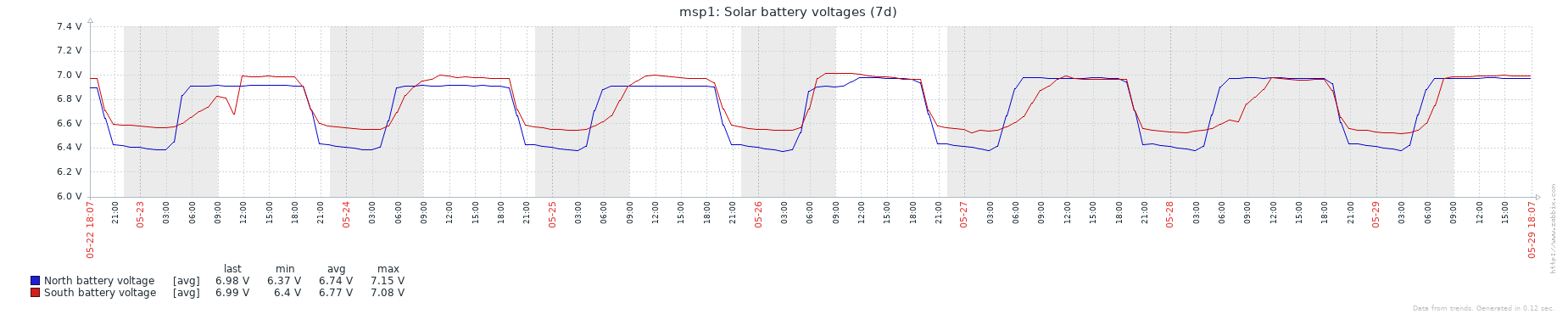 On south side I'm using 6V AGM VRLA acid battery (as far as I remember 4.5 Ah), on north side battery is the same, but battery capacity is 1.3 Ah.